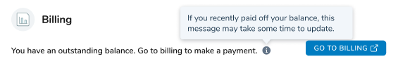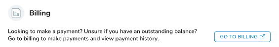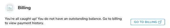 Either way, click GO TO BILLING to open your clinic's bill‑pay website to make a payment, view your payment history, or see your balance.